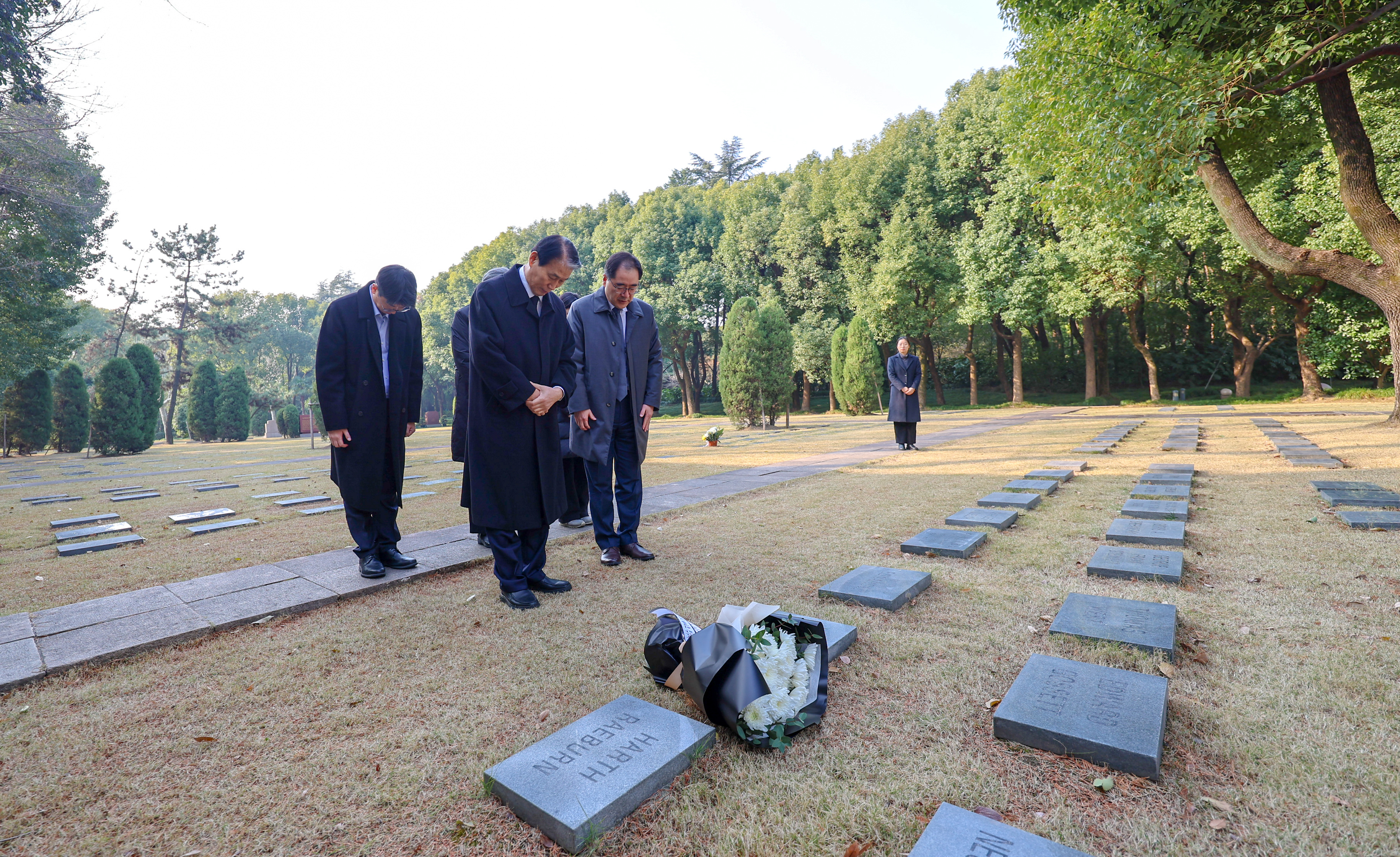 On the morning of January 8, 2026 (local time), Kwon Oh-eul, Minister of Patriots and Veterans Affairs of the Republic of Korea, who is visiting Shanghai, China on the occasion of the 100th anniversary ceremony of the Provisional Government of the Republic of Korea Building in Shanghai, visited the graves of Korean independence activists located at the International Cemetery in Shanghai and laid flowers at the grave of Patriot Lee Deok-sam.