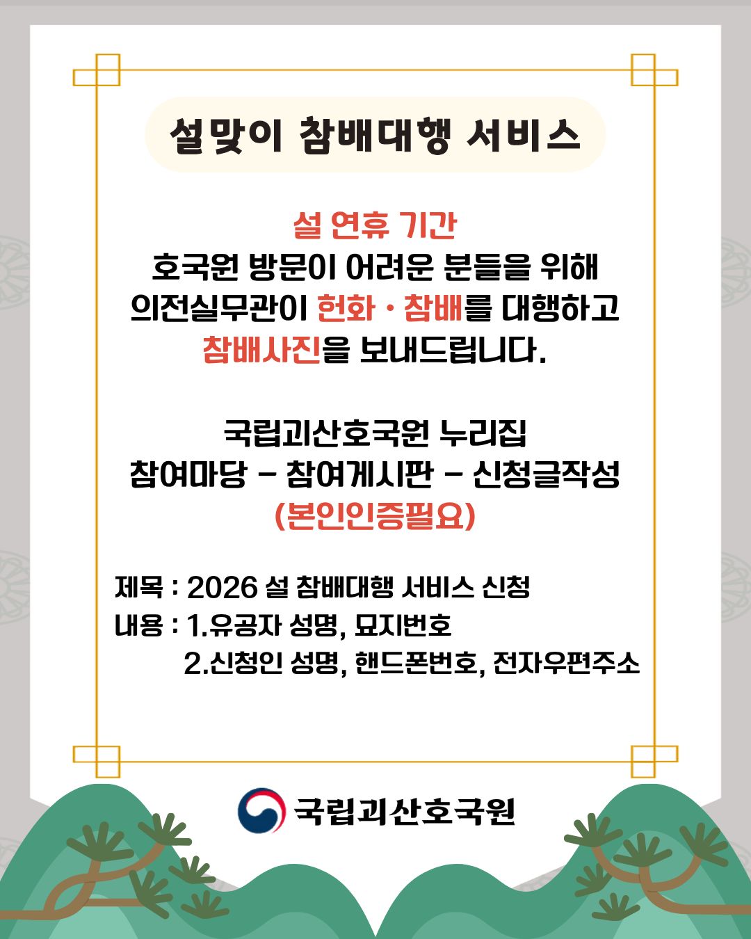 | 2026 설맞이 참배대행 사진 전송 서비스 신청 | |