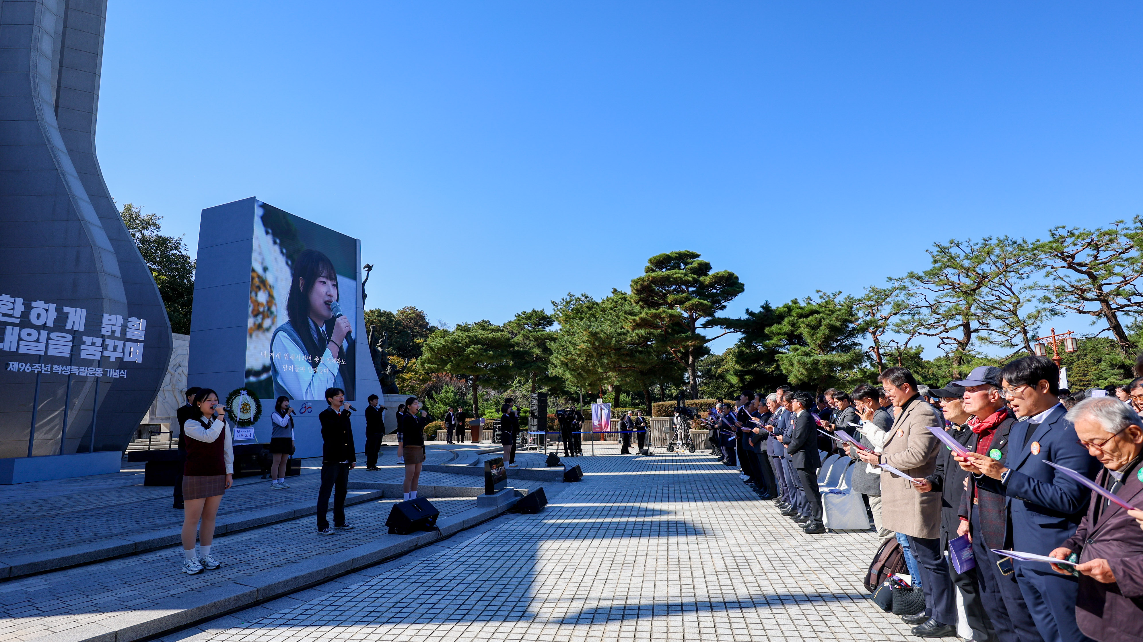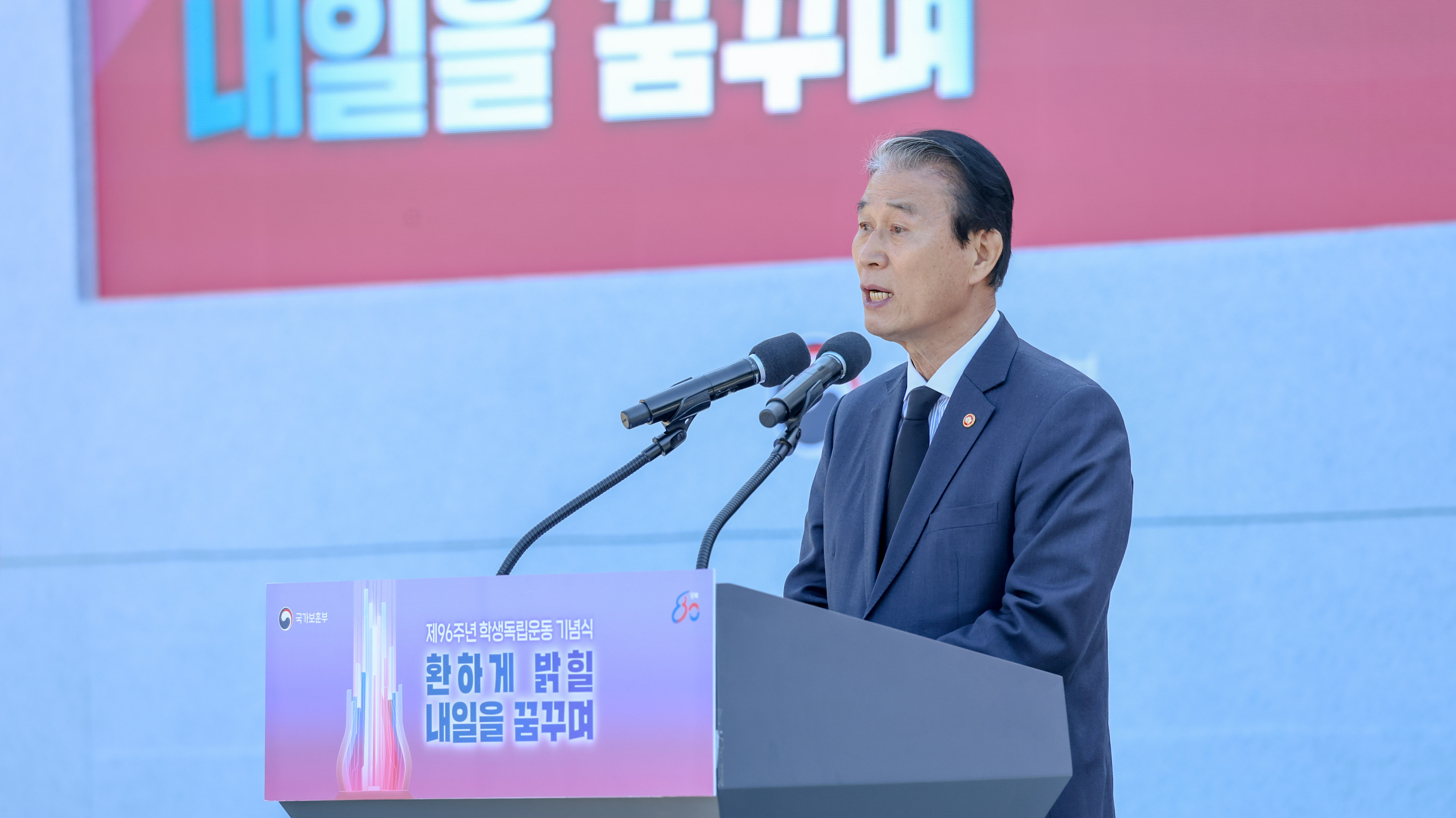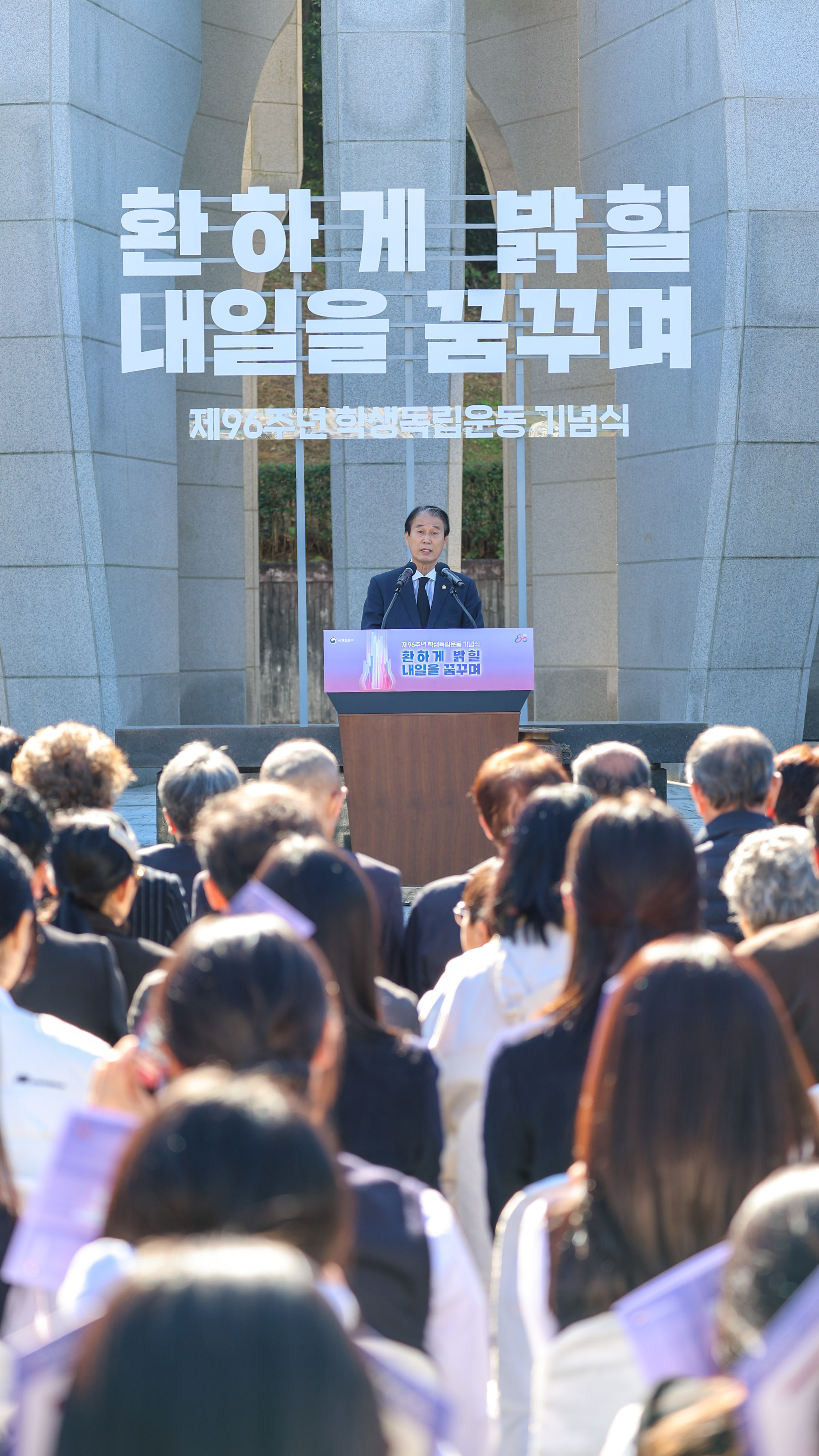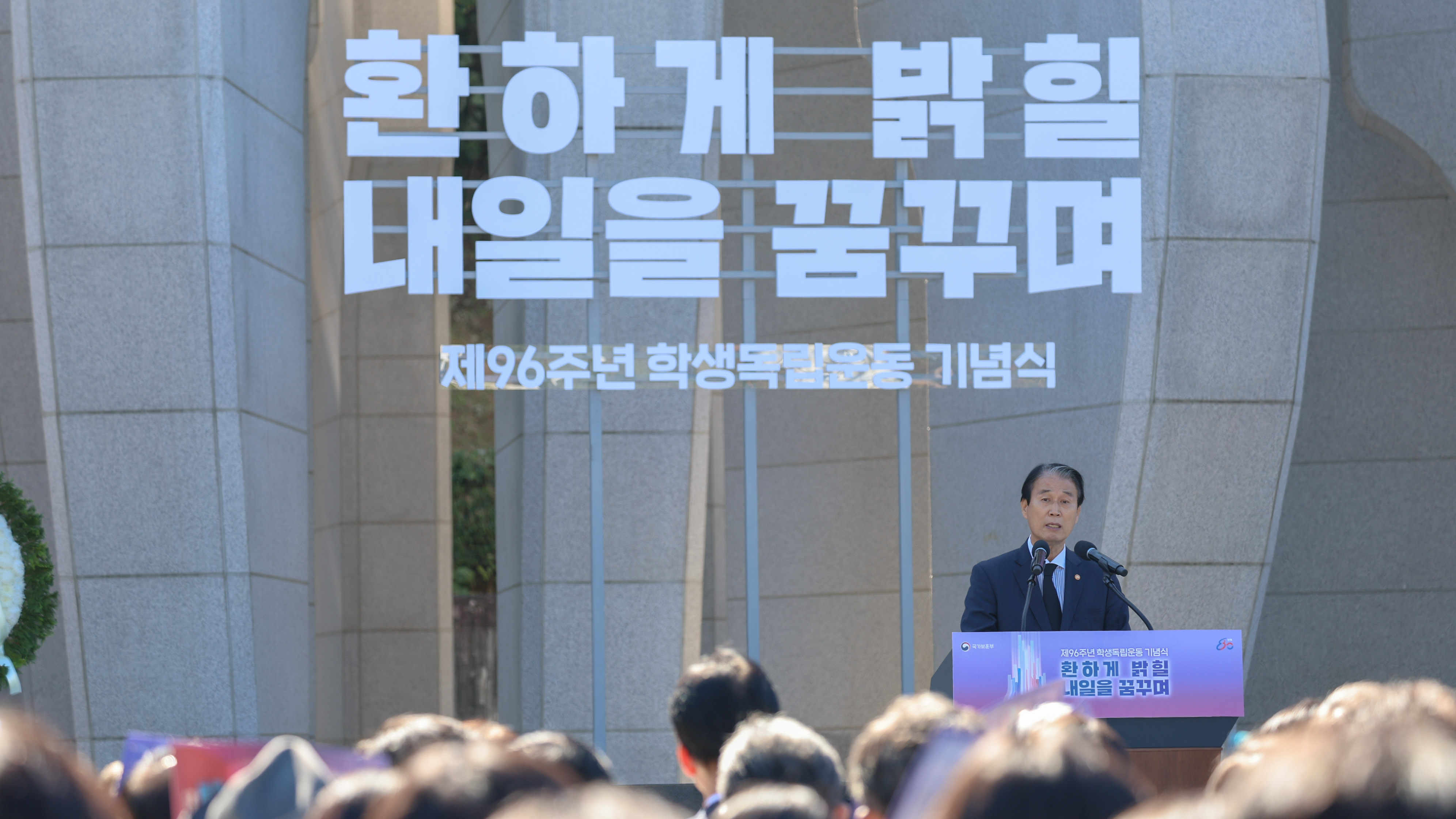 권오을 국가보훈부 장관이 3일 오전 광주시 서구 학생독립운동기념탑에서 열린 제96주년 학생독립운동 기념식에 참석하여 기념사를 하고 있다.