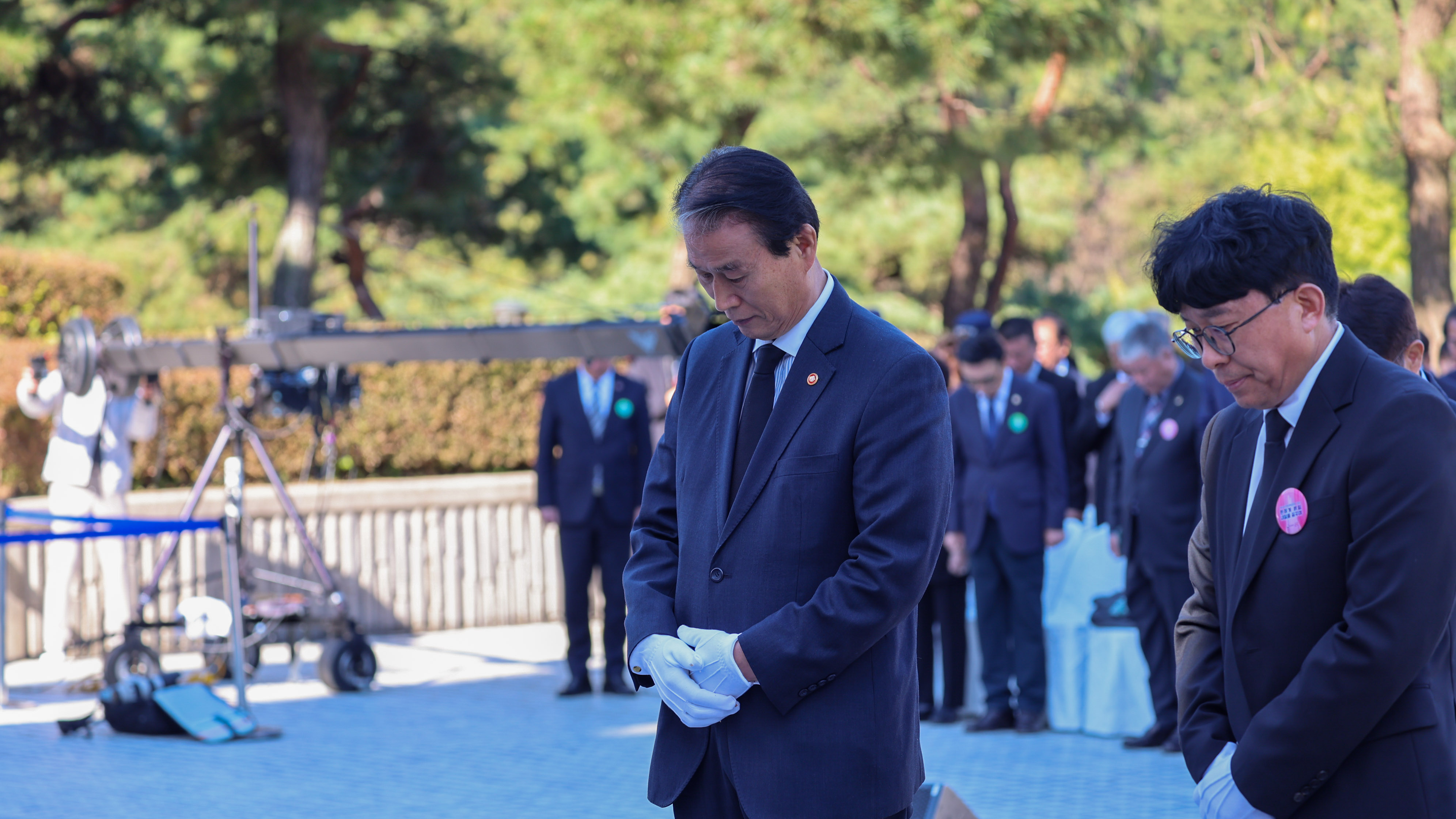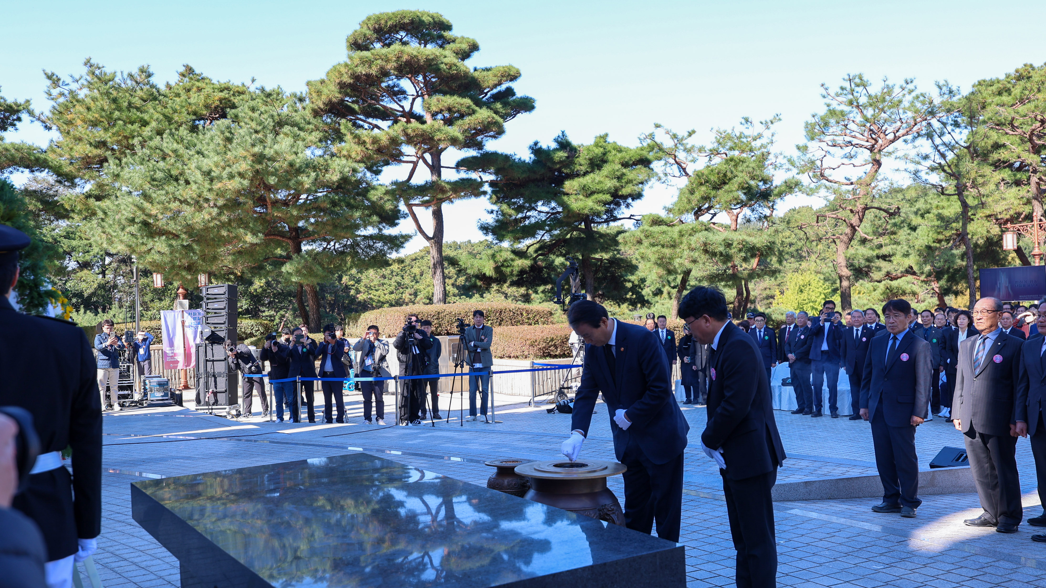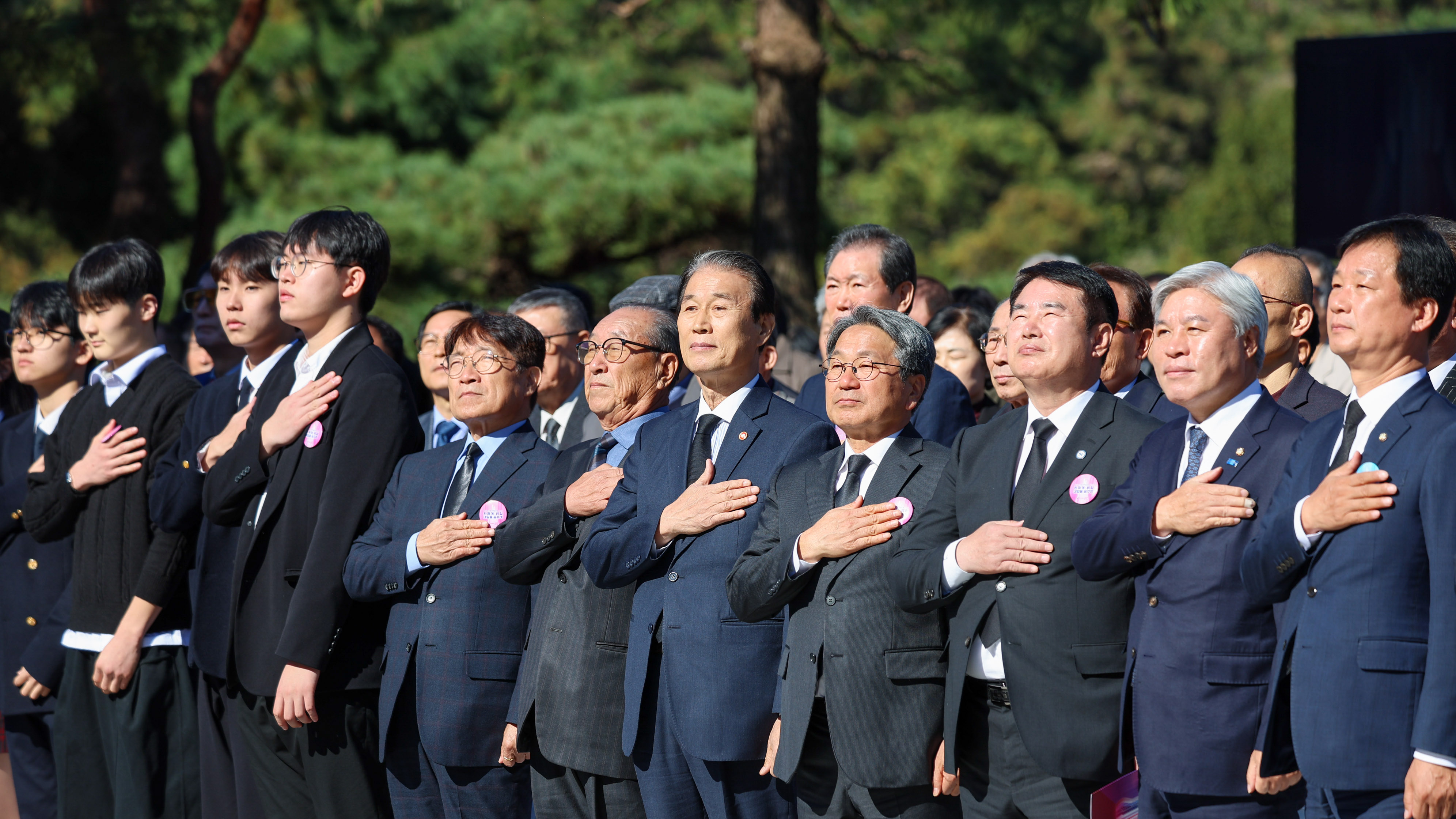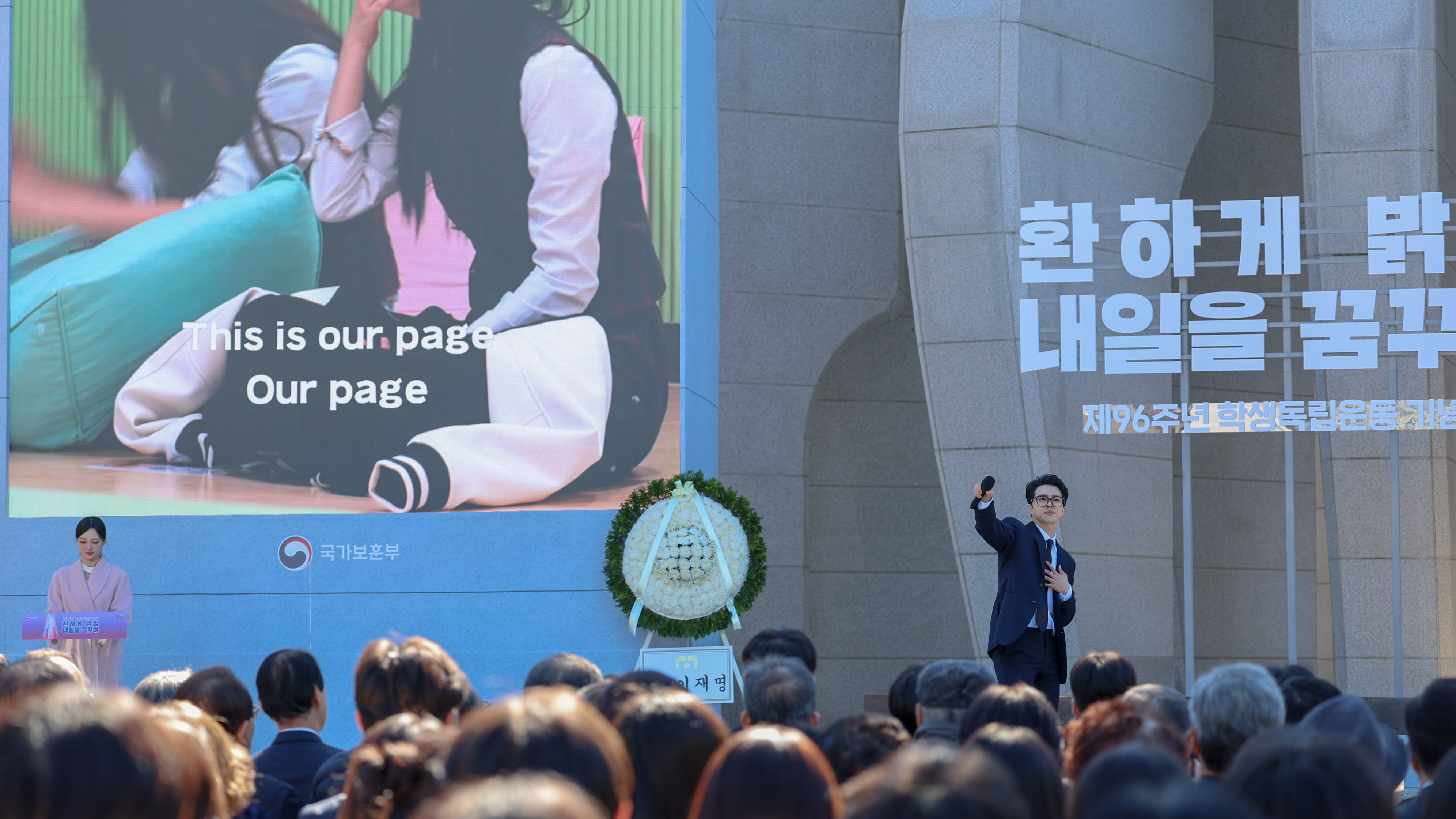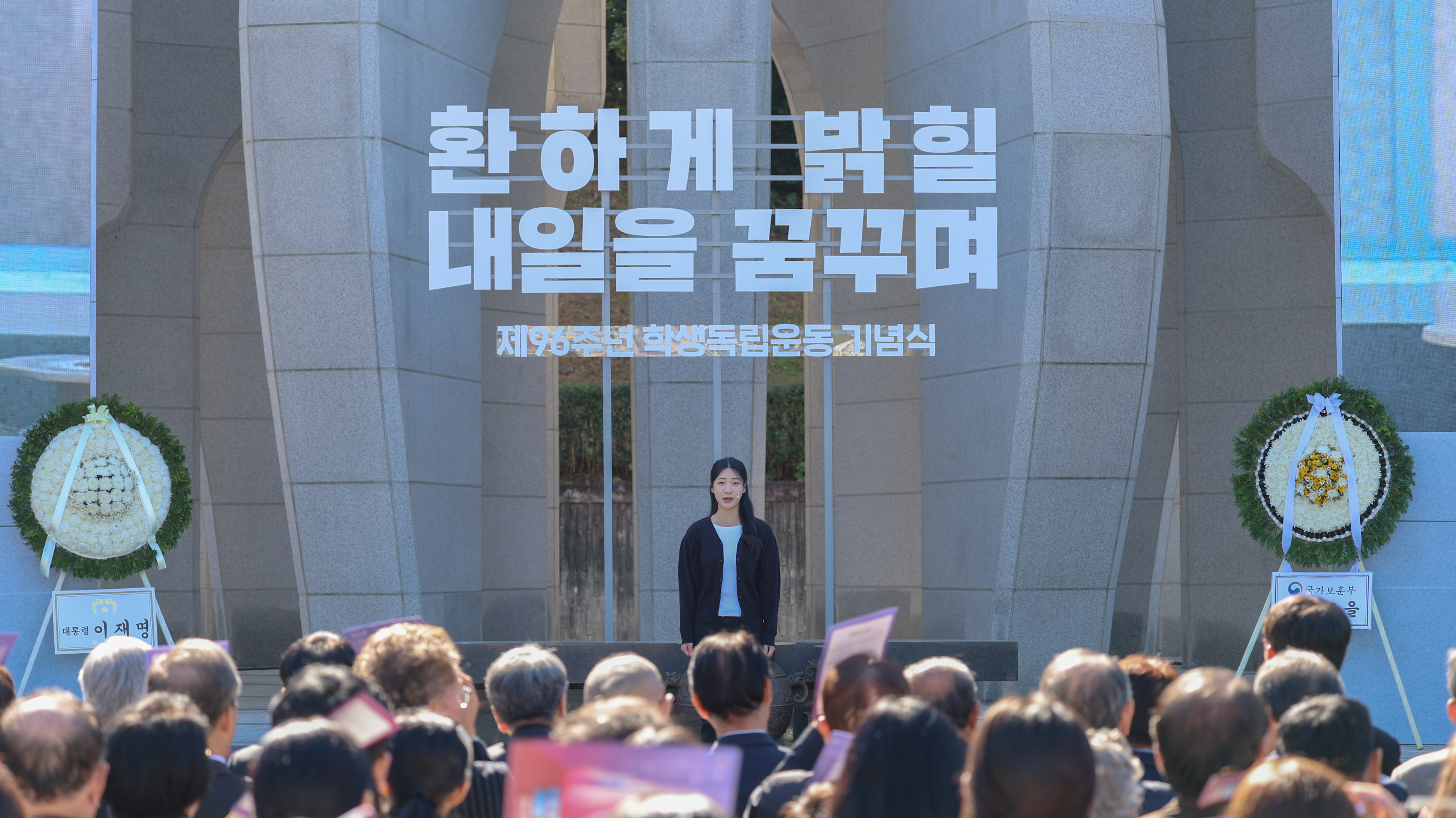 권오을 국가보훈부 장관이 3일 오전 광주시 서구 학생독립운동기념탑에서 열린 제96주년 학생독립운동 기념식에 참석하여 기념사를 하고 있다.