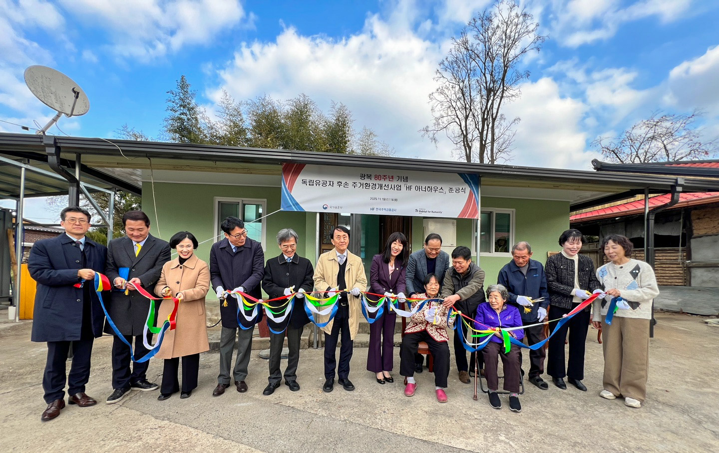 강윤진 국가보훈부 차관이 19일 오후 충남 청양군에 계시는 故 우두명 애국지사 후손인 우제순씨 자택에서 열린 국가유공자 주거환경개선사업 아너하우스 준공식에 참석하여 주요내빈들과 함께 테이프커팅 및 기념촬영을 하고 있다.