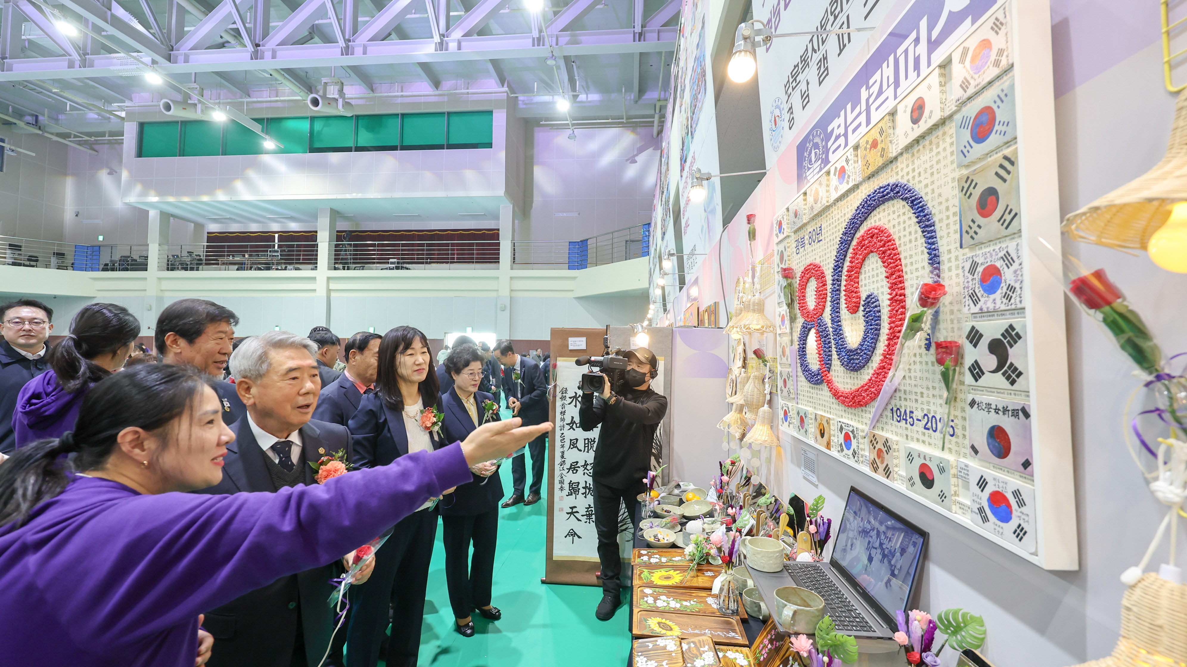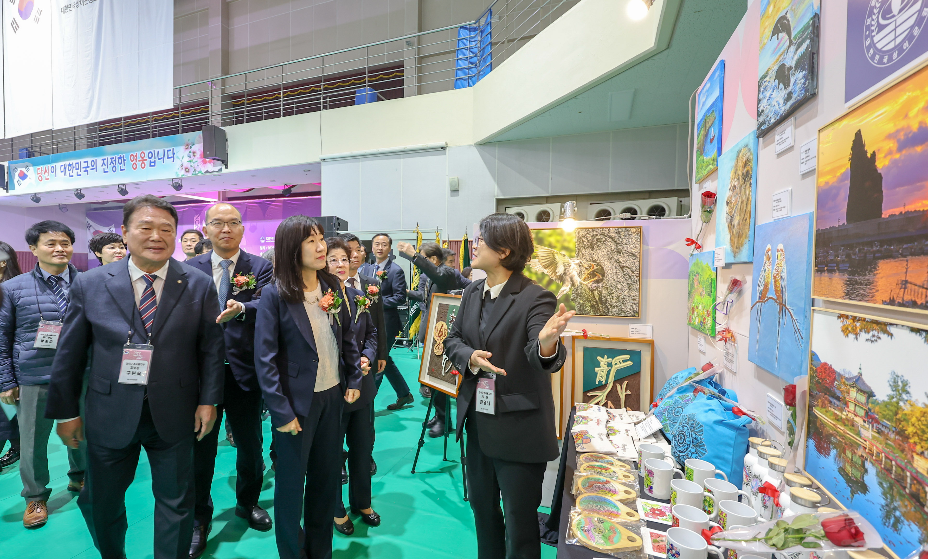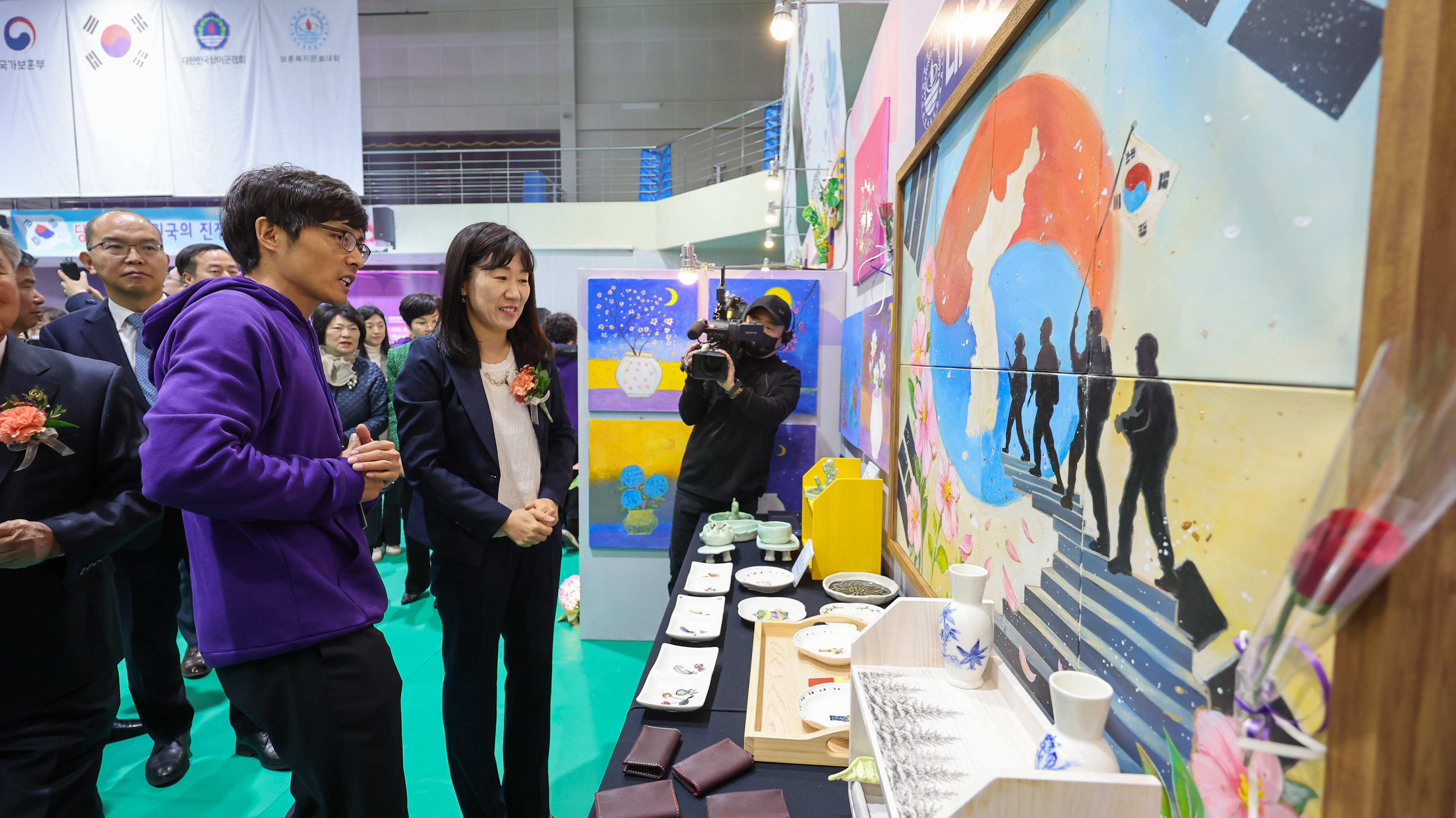 강윤진 국가보훈부 차관이 20일 오전 경기도 수원시 보훈재활체육센터에서 열린 상이군경회 2025년 보훈복지문화대학 창작예술제에 참석하여 유을상 대한민국상이군경회장과 함께 전시품을 둘러보고 있다.