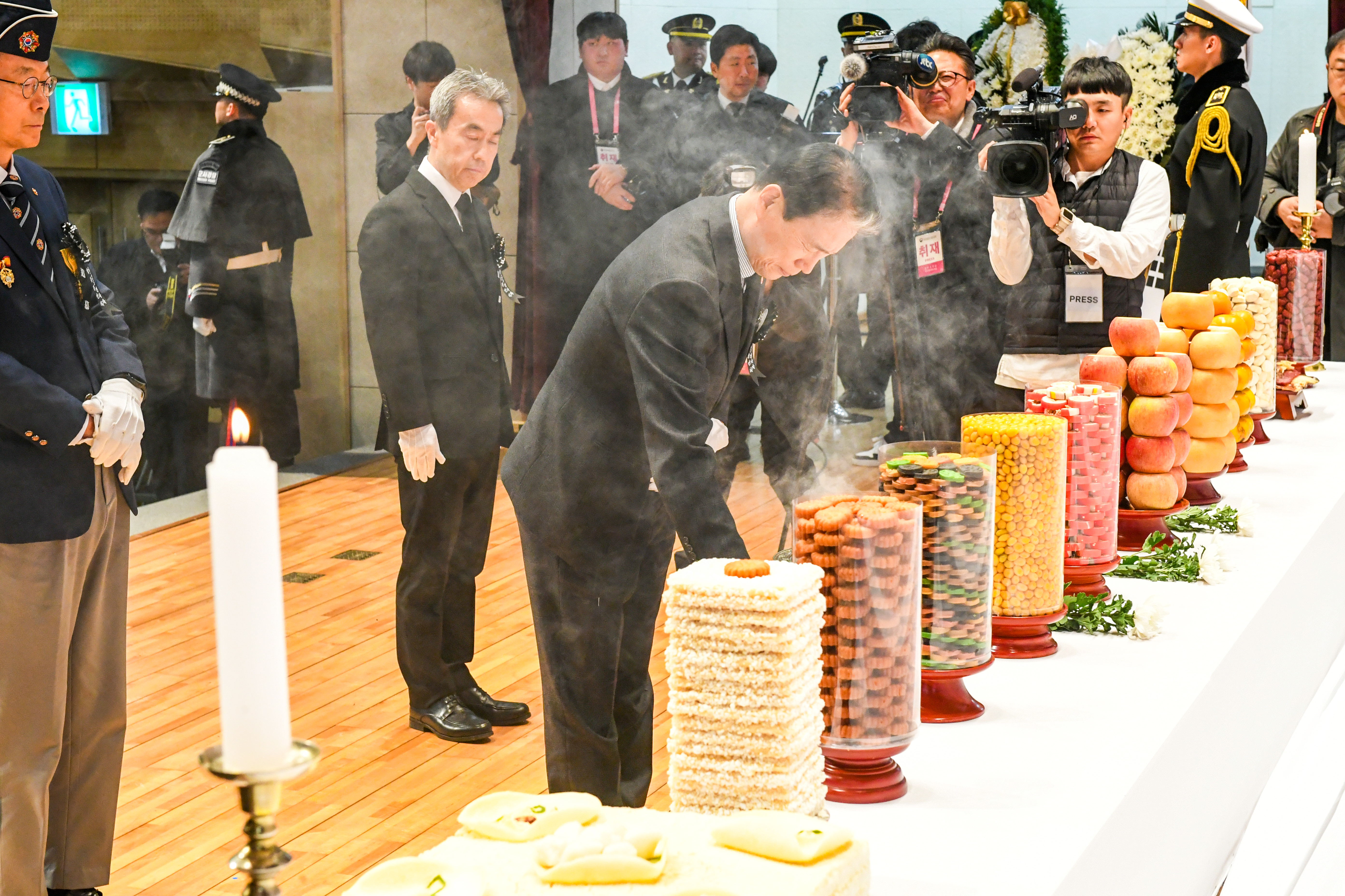권오을 국가보훈부 장관이 15일 오전 서울 동작구 국립서울현충원 현충관에서 열린 6·25전쟁 전사자 발굴유해 합동 봉안식에 참석하여 헌화및 분향을 하고 있다.