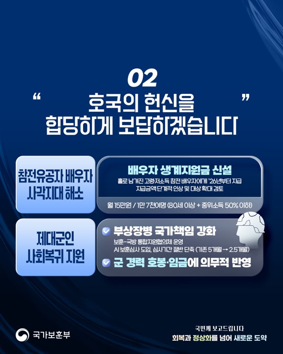 국가보훈부(국문) - 카드뉴스 상세보기 - 제목, 내용 정보 제공 의무복무 제대군인 군 경력 공공부문 반영 의무화 목록 게시물삭제 삭제사유선택 광고 반복작성 욕설 본인삭제 관련없음 게시물삭제 다음글 국가유공자 보상금 5% 인상 및 재해부상군경 7급 가족수당 지급