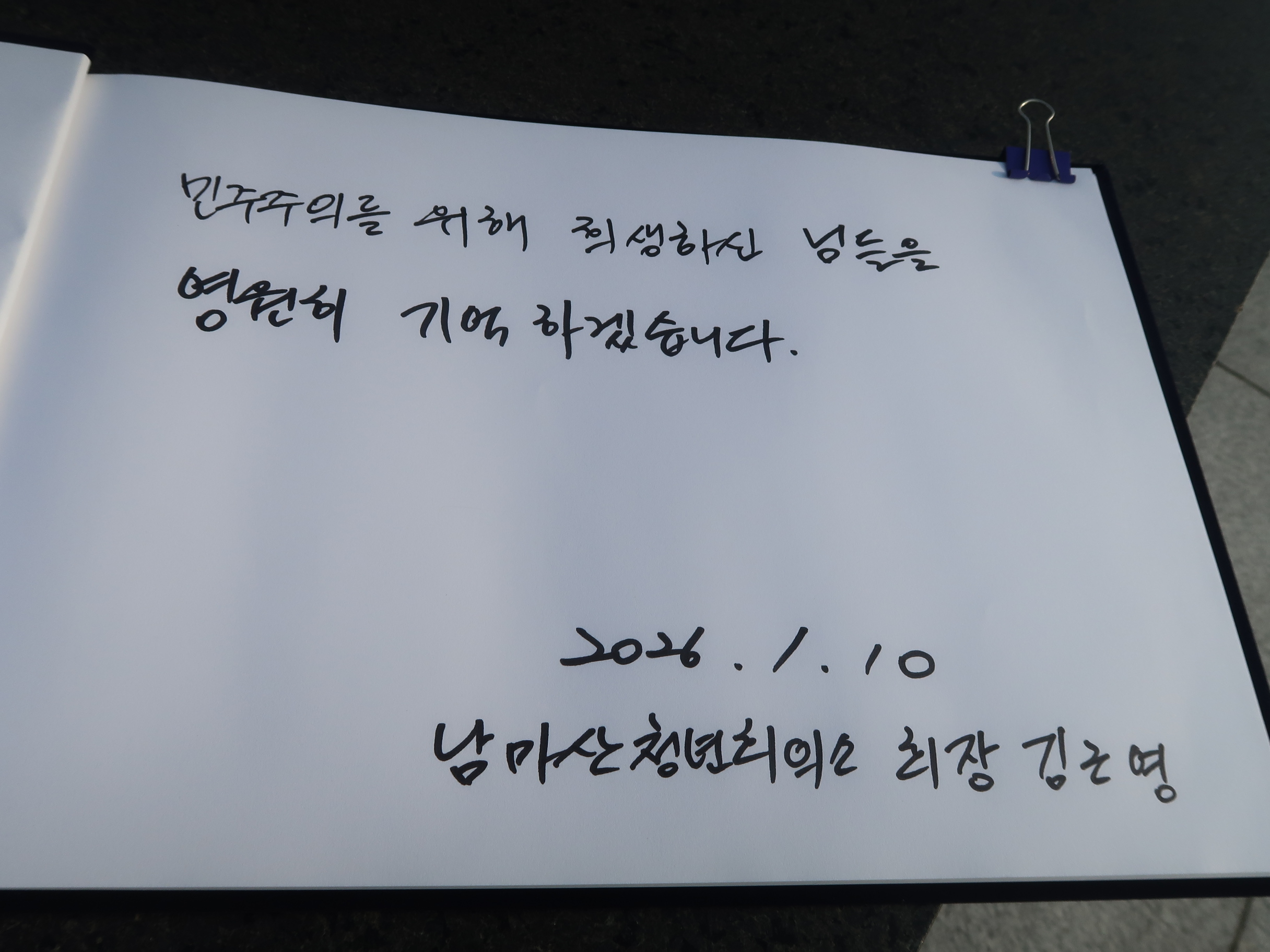 국립3·15민주묘지 - 포토갤러리 상세보기 - 제목, 내용, 파일 정보 제공 2026.01.10.남마산청년회의소 참배 2026.01.10.남마산청년회의소 참배 목록 게시물삭제 삭제사유선택 광고 반복작성 욕설 본인삭제 관련없음 게시물삭제 이전글 2026.01.10.마산청년회의소 참배 다음글 2026.01.05.구자도 민주평화통일자문회의 창원시협의회 제2지회장 신년참배