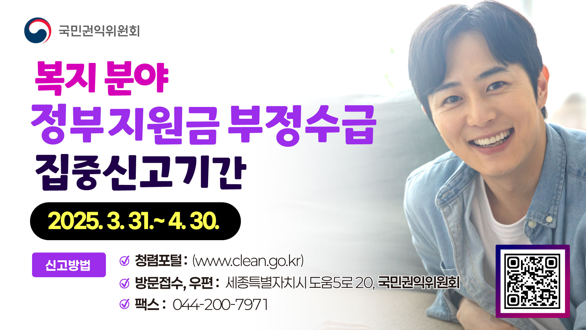 복지분야 정부지원금 부정수급 집중신고기간<br>2025.3.31.~4.30.