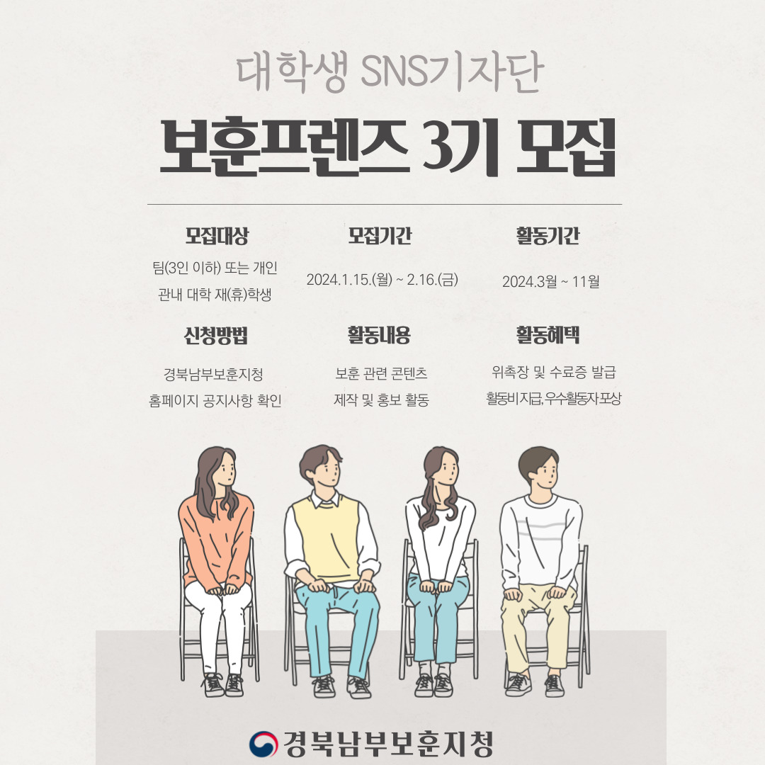 경북남부보훈지청 2024년 대학생 SNS 기자단 보훈프렌즈 3기를 붙임과 같이 공고합니다. |