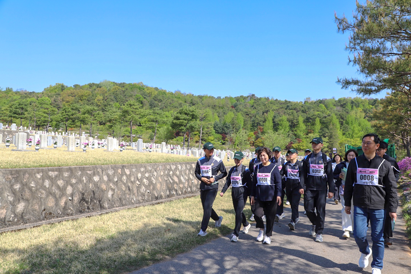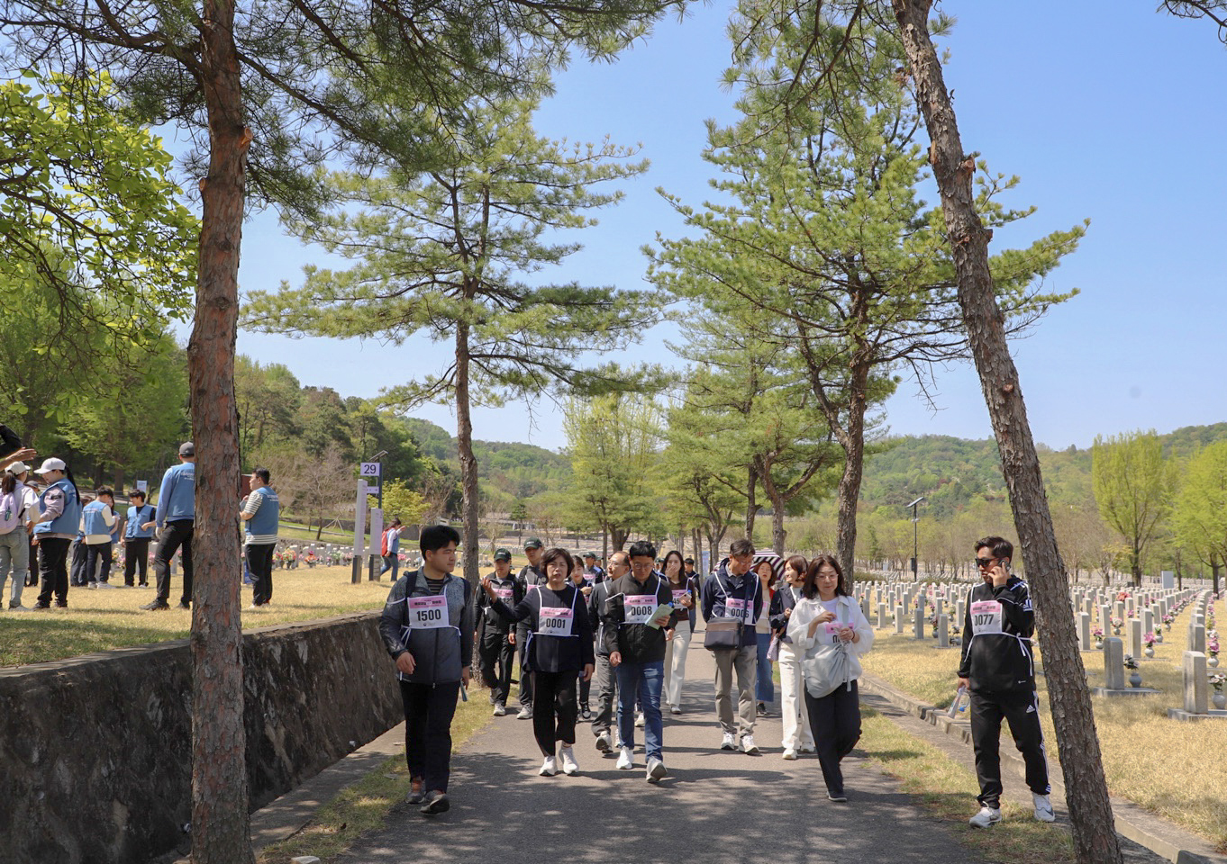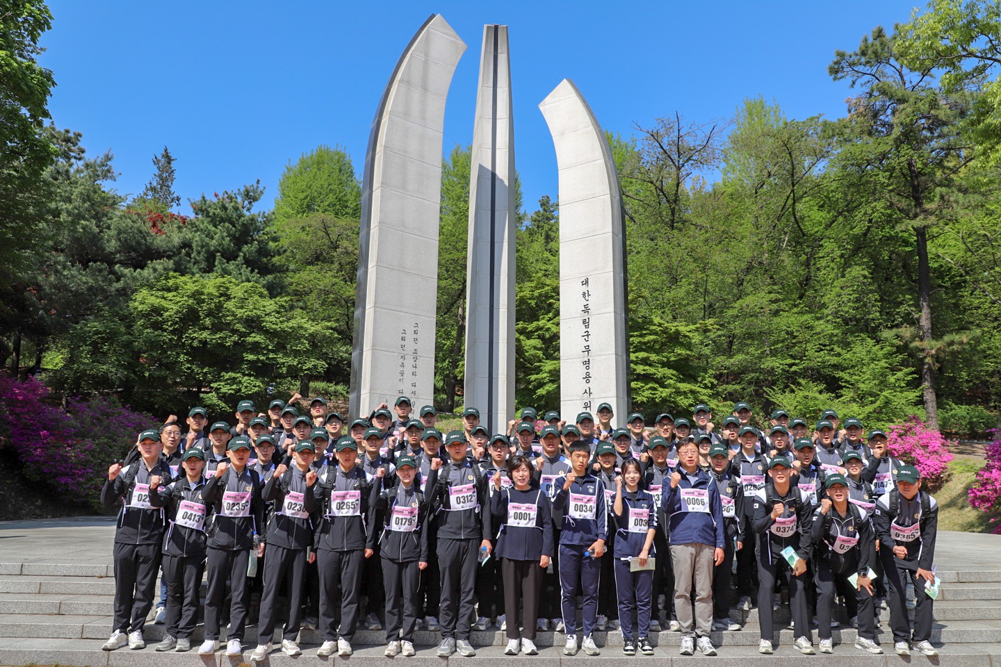 강정애 국가보훈부 장관이 26일 오전 서울시 동작구 국립서울현충원 현충선양광장에서 열린 2025 메모리얼 봄꽃 하이킹 행사에 참석하여 육군사관학교 생도들과 함께 대한독립군무명용사위령탑 앞에서 기념촬영을 하고 있다.