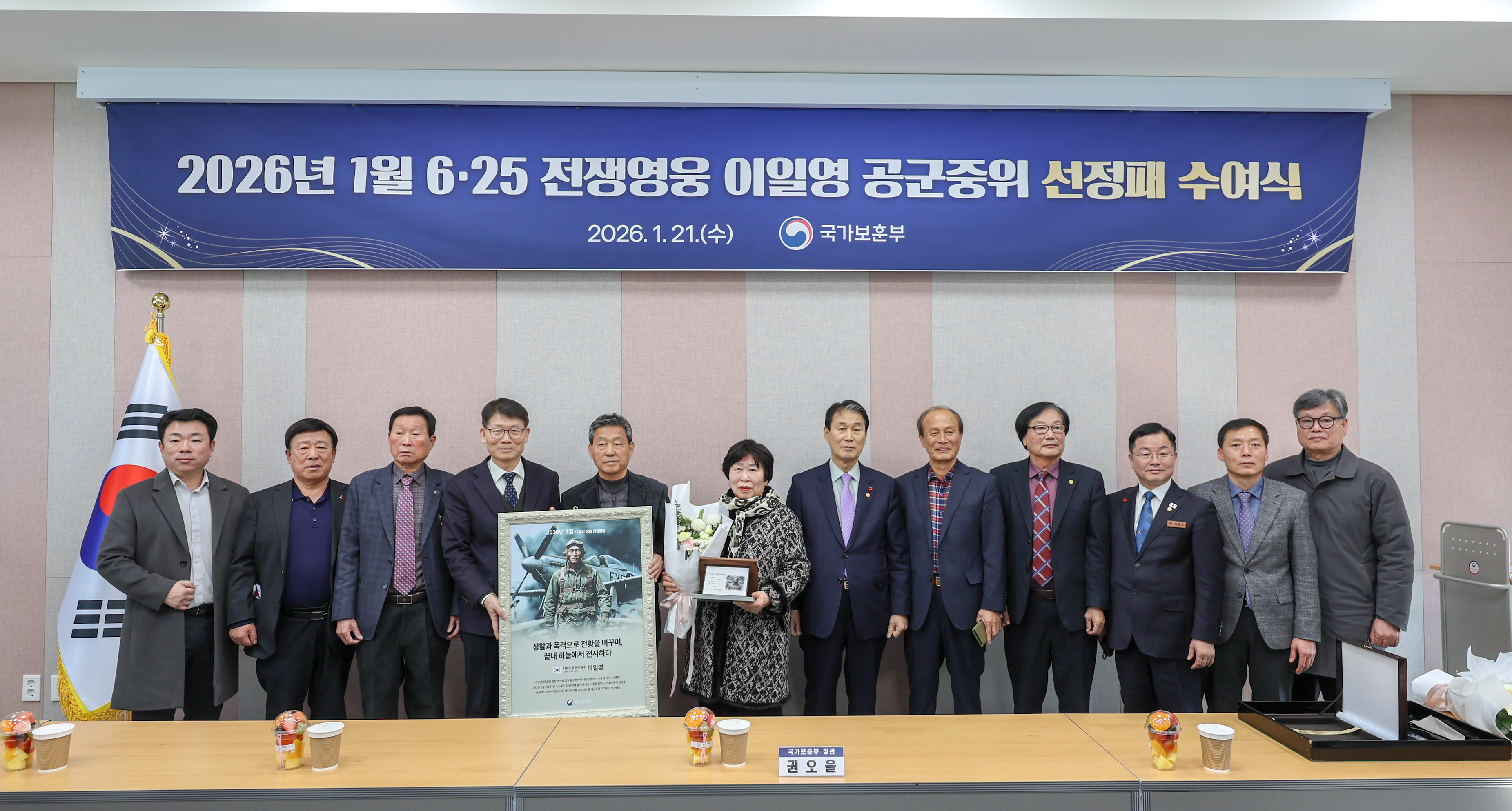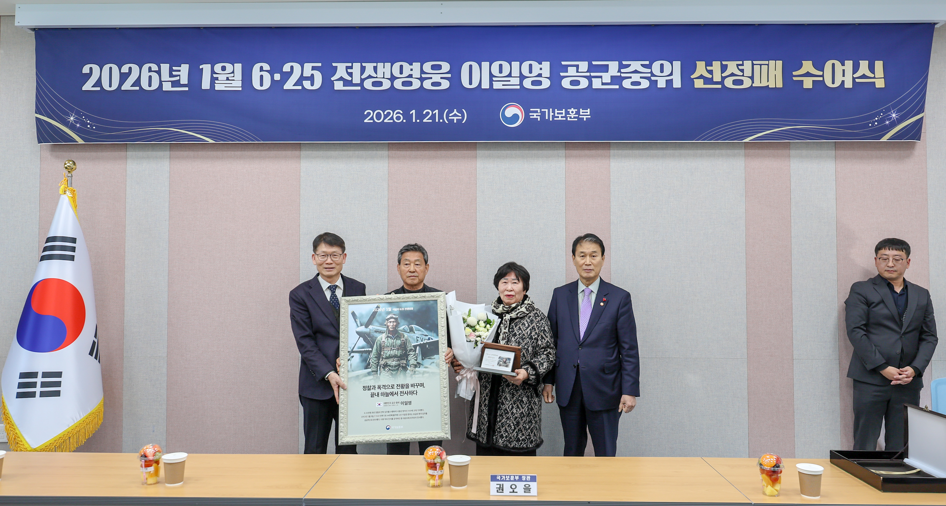 권오을 국가보훈부 장관이 21일 오후 경북 예천군 정부경북지방합동청사에서 열린 26년 1월의 6.25전쟁영웅 선정패 수여식에 참석하여 故 이일영 공군 준위 유가족 이춘영씨에게 선정패를 전달해 드리고 있다.