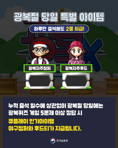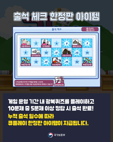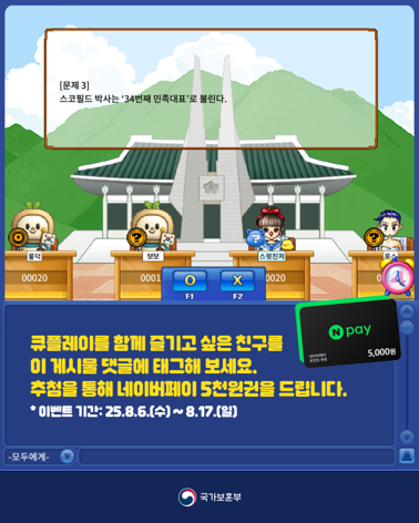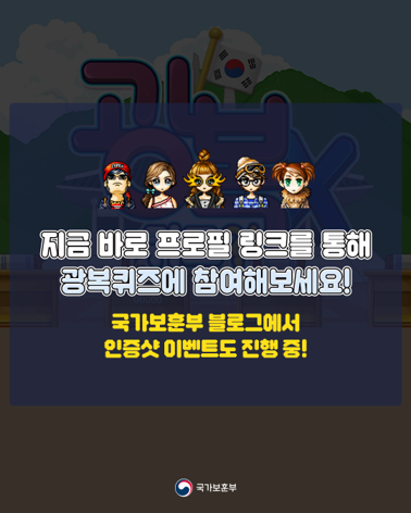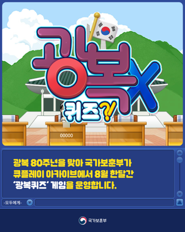 국가보훈부(국문) - 카드뉴스 상세보기 - 제목, 내용, 파일 정보 제공 광복80 큐플레이 아카이브 협업 OX 퀴즈 이벤트 파일 jpg 문서 그림14.jpg png 문서 그림15.png png 문서 그림16.png png 문서 그림17.png png 문서 그림18.png png 문서 그림19.png 목록 게시물삭제 삭제사유선택 광고 반복작성 욕설 본인삭제 관련없음 게시물삭제 이전글 국가유공자 보상금 5% 인상 및 재해부상군경 7급 가족수당 지급 다음글 국외 독립유공자 유해 봉환