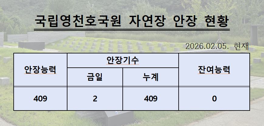 국립영천호국원 자연장 안장이 2026년 02월 05일 만장 되었습니다.